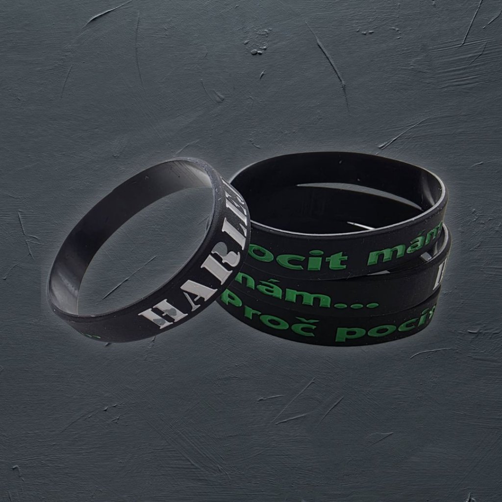 Silikonový náramek s vyraženým logem Harlej a nápisem.